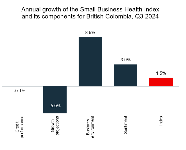 Improvement of the business environment was the largest contributor to this increase as the economy is starting to show signs of recovery. The inflation rate has returned to the Bank of Canada’s 2% target and the central bank started cutting its policy rate in June 2024. As a result, business sentiment is improving, with SMEs expecting a better economic outlook and access to credit is easing. However, sluggish sales and lower investment plans are still hindering SMEs, which is having a negative effect on the growth projections component. The credit performance of SMEs still hasn’t fully recovered from the impact of high interest rates, even though it is slowly trending in a positive direction.