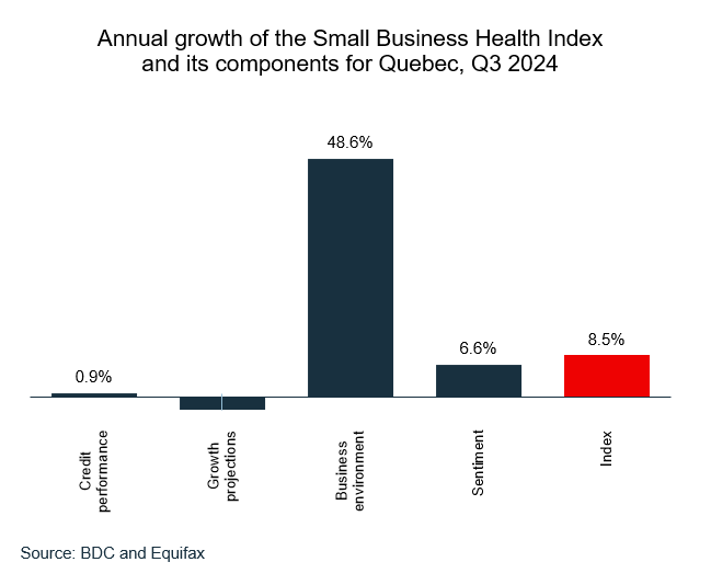 Business health in Quebec showed strong increase in Q3 2024 following a stagnant GDP in 2023. Overall, the index stood at 100.0, an 8.5% increase compared to a year ago and a 3.2% increase against the previous quarter.