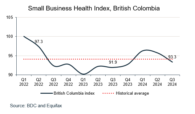 The health of Ontario small businesses has been improving since the beginning of 2024, reaching 97.5 in Q3 2024—growing by 3.2% year-over-year and 1.8% over the previous quarter.