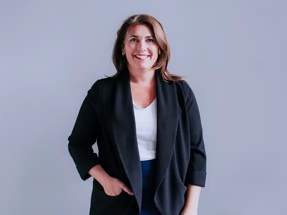 Woman smiling and holding up her hand