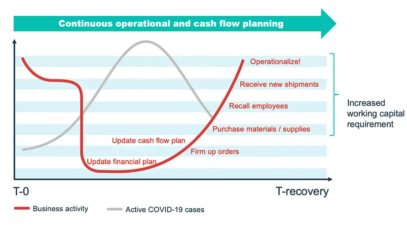 Here we have overlaid business activity against active COVID-19 cases. You will see that once the cases have peaked, we will recover. At recovery you will need to stay ahead of the game: