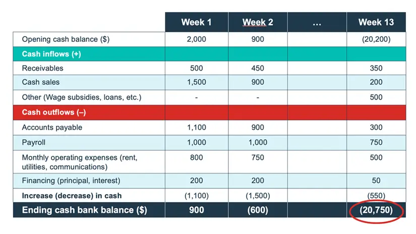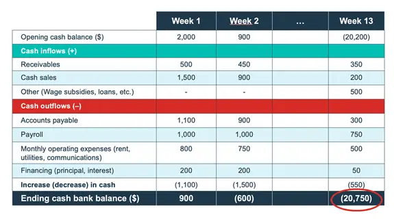 They are good for Week 1. But look at what happens in Week 2—the outflows start to drain the bank account to a deficit position. After 13 weeks, there is a shortage of $20,750.