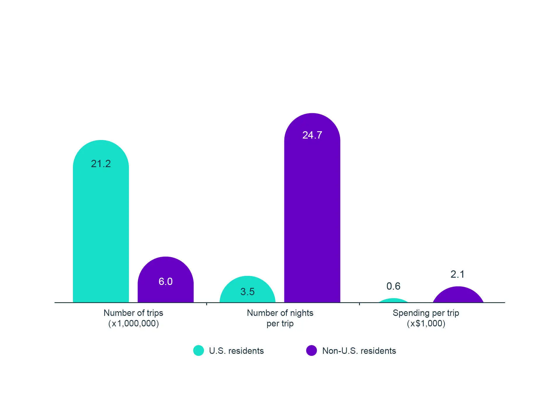 Figure 2: Number of trips and travelling behaviour of U.S. and non-U.S. visitors to Canada, 2023