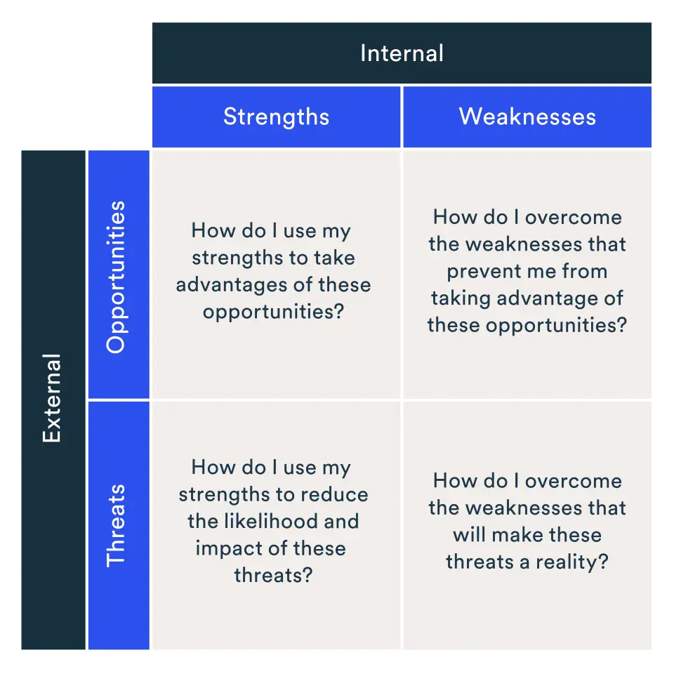 SWOT analysis is sometimes called internal-external analysis. That’s because strengths and weaknesses are internal to your organization, while opportunities and threats are external factors.