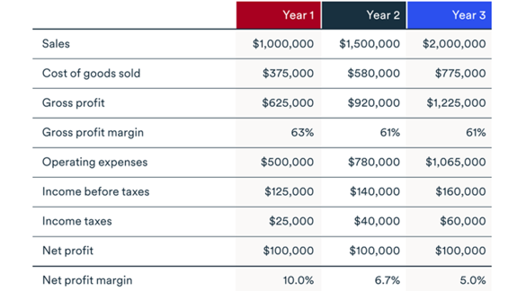 Jaillet gives the example of a company whose top line rises from $1 to $2 million a year, while the bottom line stays at the same $100,000. In this case, net profit margin has fallen by half from 10% to 5%.