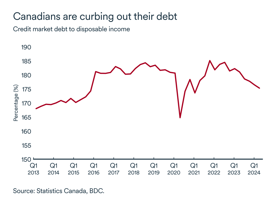 However, household debt as a proportion of disposable income continued to fall in the second quarter, reaching 175.5—the lowest level since the first quarter of 2021. This implies that income growth has outstripped credit growth, a positive sign that the Canadian economy is becoming less reliant on consumer debt.