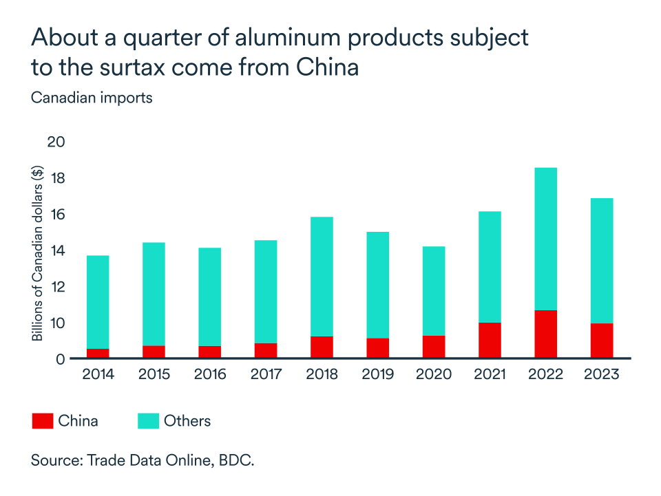 The impact should be more severe for the aluminum market since more than a fifth of Canada's aluminum imports come from China, but only about 8% of the country's total imports of steel.