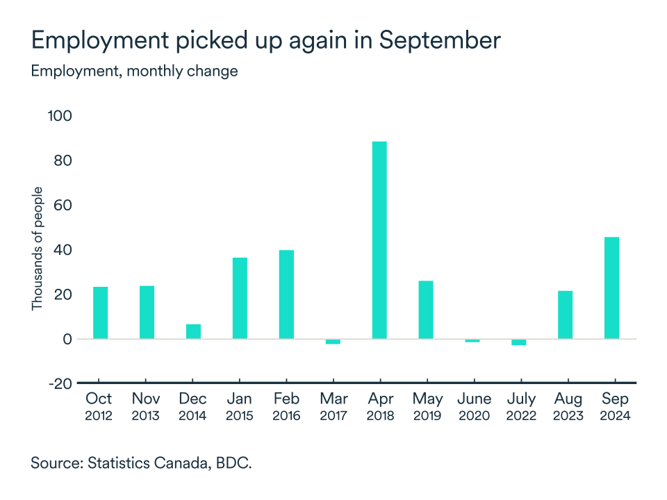 The unemployment rate ticked down in September for the first time this year, reaching 6.5%. Job creation has changed little from month to month since May but ended the third quarter with a bang. In September, 47,000 jobs were created across Canada, compared with 22,000 the previous month. Another good news is that employment gains were concentrated in the private sector (+61,000), a likely indication that businesses are slowly regaining their footing.
