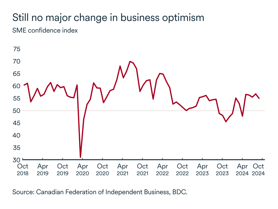 For the past few months, Canadian optimism has not changed much. In September, the CFIB business confidence index for the coming year remained broadly unchanged compared to August’s level. The index stayed above the fateful 50 threshold, gearing slightly down to 55 (from 56.8). Businesses remain on the lookout in the shorter term and optimism has been quite muted despite the interest rate cuts.