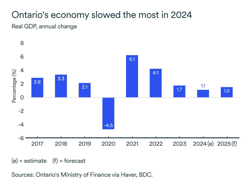 At the start of 2025, sectors that struggled in 2024 continue to deal with uncertainty generated by the threat of trade tariffs. Last year, a weak housing market weighed on the construction sector and weaker demand for goods hurt the manufacturing sector. Manufacturing sales declined by 5.4% at year end, dragged down by a decline of 7.9% in durable goods sales and retooling of plants in the Ontario and the U.S.
