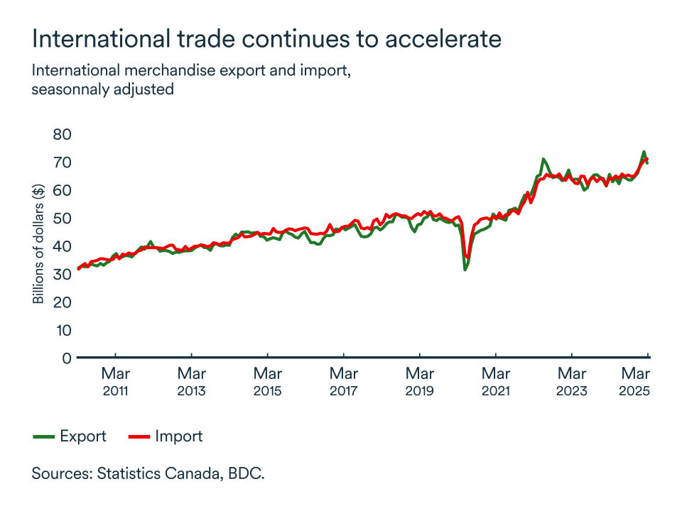 Canadian exports peaked in January but slowed in February. The slowdown was anticipated, as the U.S. probably accelerated purchases of Canadian goods early in the year in anticipation of the imposition of tariffs. However, Canada continued to trade internationally with imports net of tariffs remaining strong in February.