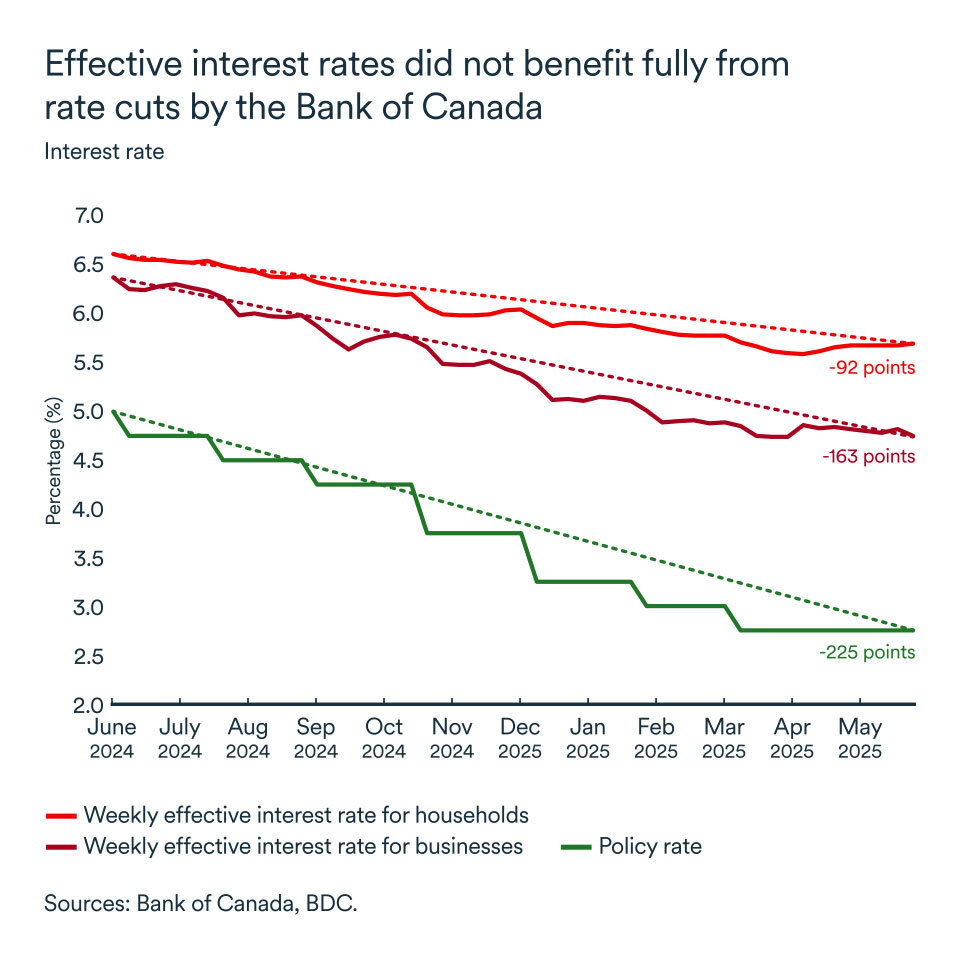 Over the past year, the Bank of Canada has lowered its key interest rate by 2.25% in an effort to bring down borrowing costs and stimulate the economy. But even as the bank’s rate dropped from 5.0% to 2.75%, interest rates for consumers and businesses have remained stubbornly high.