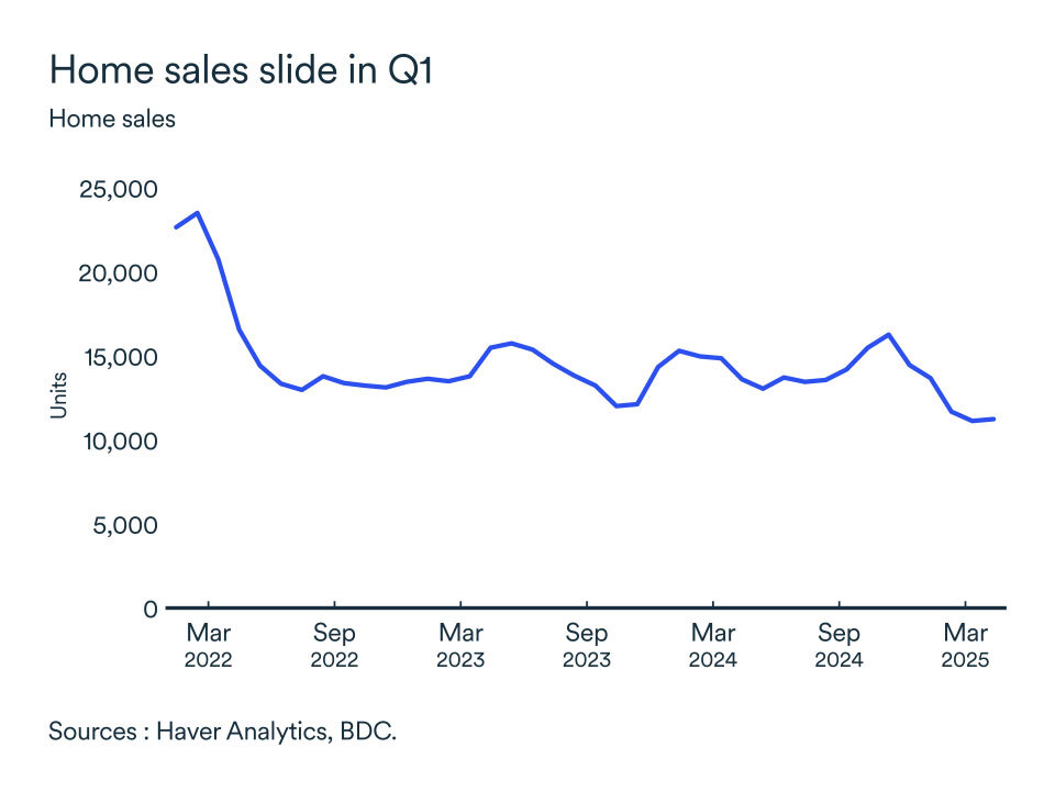 Despite lower interest rates, households remained cautious due to declining confidence in the economic outlook and concerns about job security. April saw lack-lustre home sales as economic uncertainty likely deterred potential buyers.
