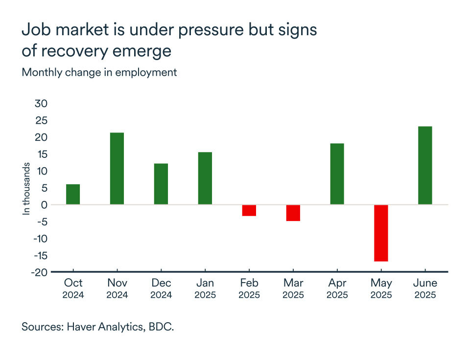 Sectors directly affected by tariffs have experienced job losses since the start of the year, weighing on employment growth. Some 49,000 jobs were lost from January to May in the construction and manufacturing sectors. However, most of these losses were offset by gains in service industries. And June data showed signs of recovery, with goods-producing sectors adding 6,000 net new jobs, including in construction and manufacturing.