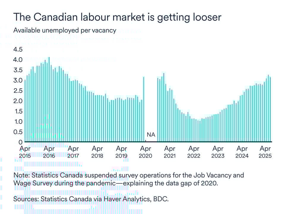 There were 3.2 unemployed people for every job vacancy in Canada in June, a ratio that has been rising in recent months. Although there are still sectors and regions where finding workers is difficult, this is much less of an issue for business owners than it has been in recent years.