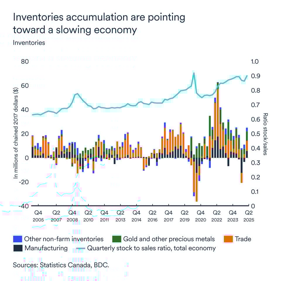 Inventories rose rapidly in the first quarter following repeated announcements of new tariffs and growing uncertainty. The trend accelerated in the second quarter when inventories surged in all sectors covered by Statistics Canada.
