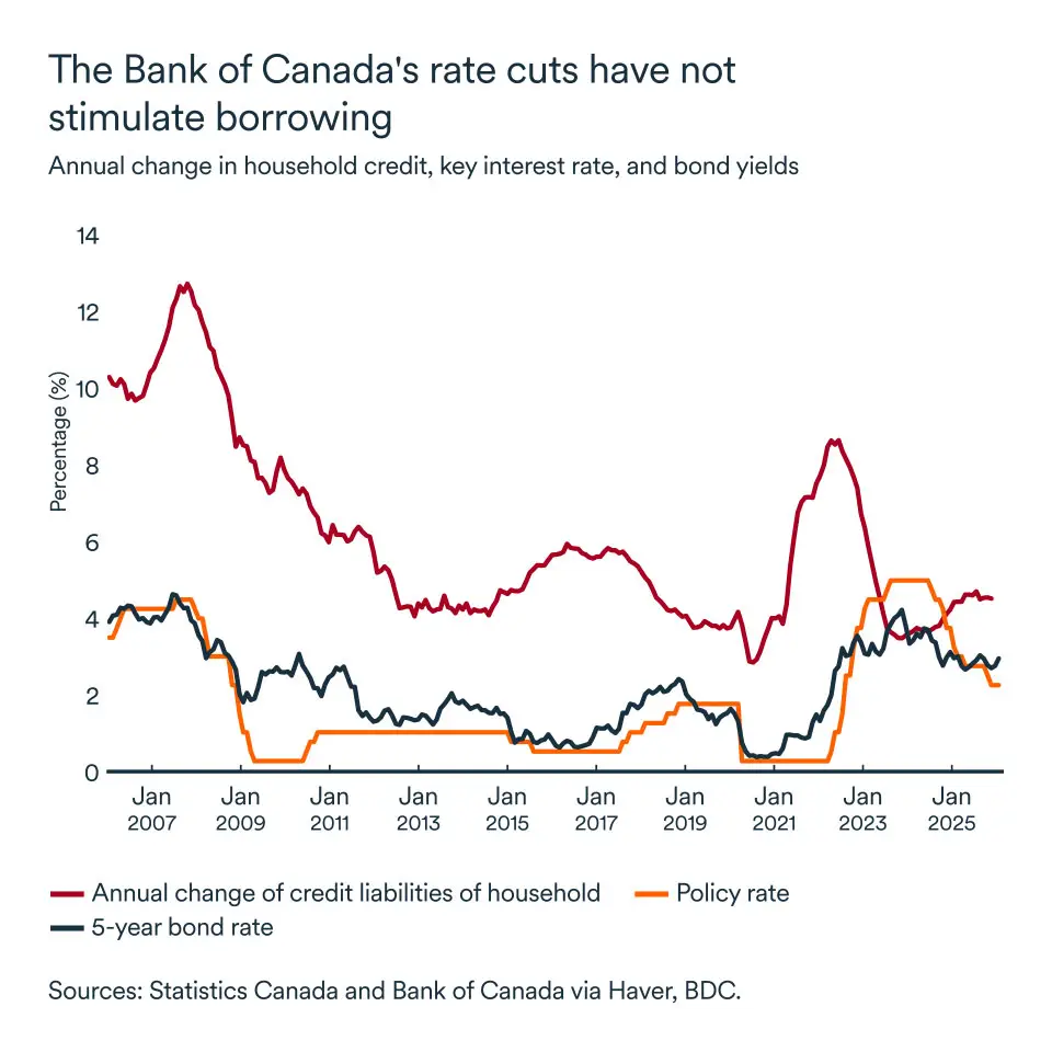 The Bank of Canada cut its key interest rate by 100 basis points in 2025, from 3.25% in January to 2.25%. However, this failed to encourage households to boost their borrowing significantly.