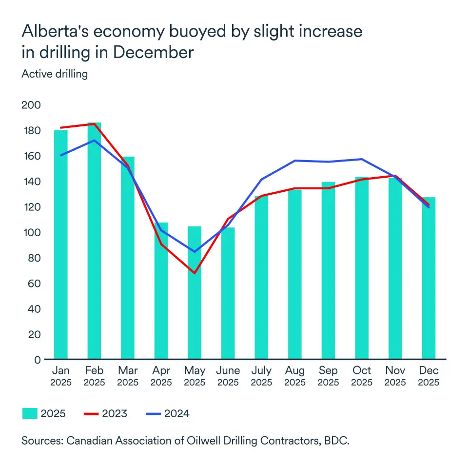 Drilling activity increased somewhat in December compared to last year, with 128 active rigs in Alberta, signalling modest investment and ongoing field operations.