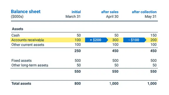 In the month of April, you record sales on credit of $200,000. For simplicity, it’s the only transaction of the month. You then record an increase in accounts receivable, from $100,000 to $300,000. In the chart below, balance sheet after sales reflects the impact of sales on accounts receivable.