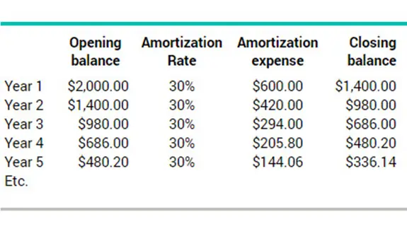 The second method is called the declining balance method. It is used for assets such as laptops or vehicles that lose much of their value early on. The amount amortized each year gets smaller as the total value of the laptop is reduced: