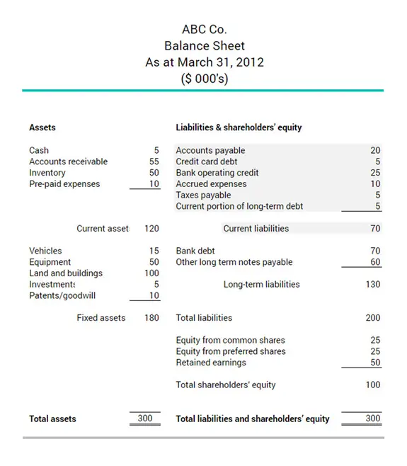 The balance sheet below shows ABC Co. had $70,000 in current liabilities as of March 31, 2012. The company has $120,000 in current assets available to cover its current liabilities; this is a healthy working capital balance.