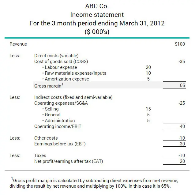 In this example, ABC’s net revenues are $100,000, while its direct expenses are $35,000. When direct expenses or COGS are subtracted from net revenues, the remainder ($65,000) is divided by $100,000 (.65), which is then multiplied by 100% to produce the gross profit margin ratio of 65%.