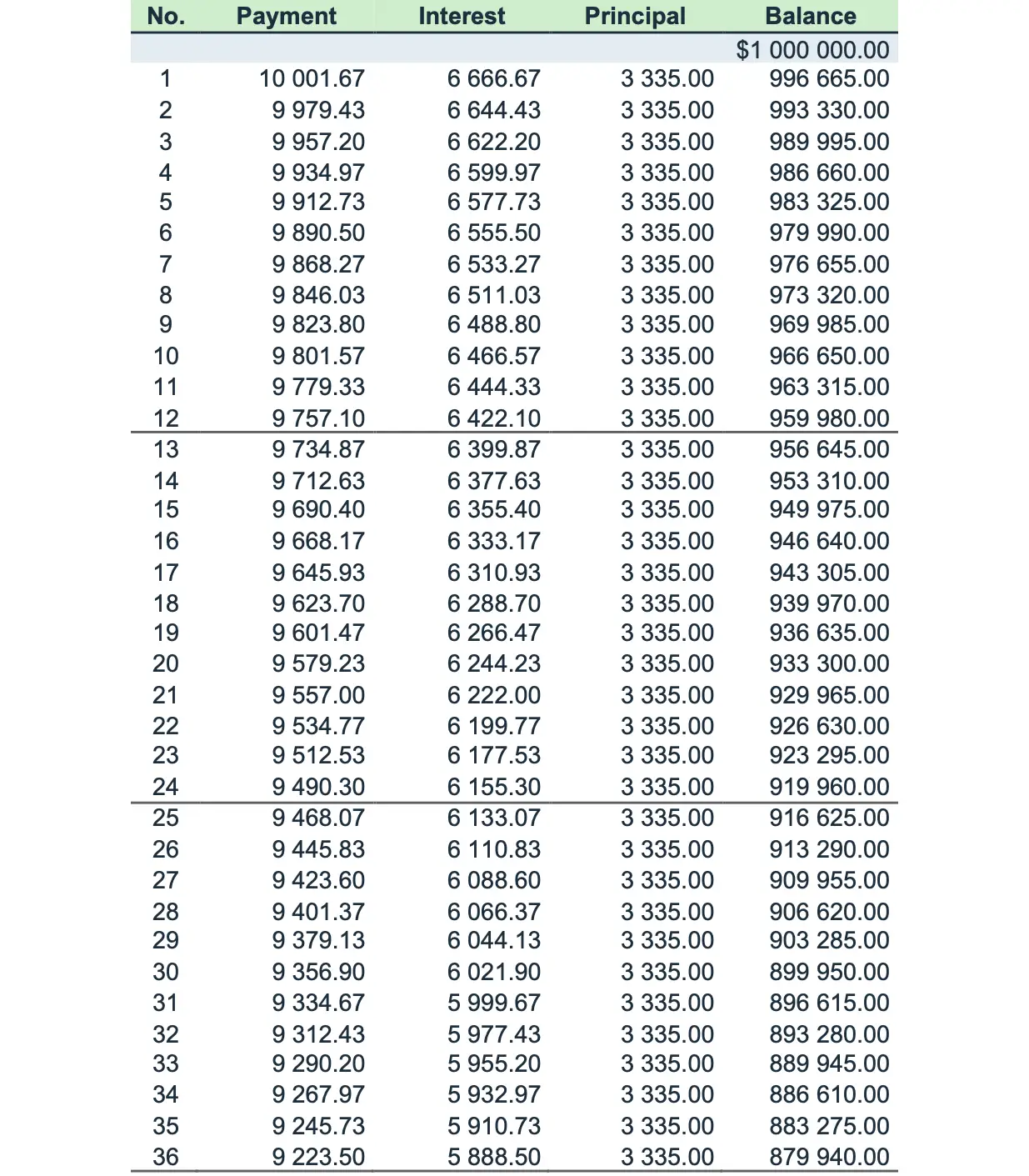 Monthly payments = Principal (Loan ÷ Number of periods) + Interest (Outstanding balance x (Interest rate ÷ 12))