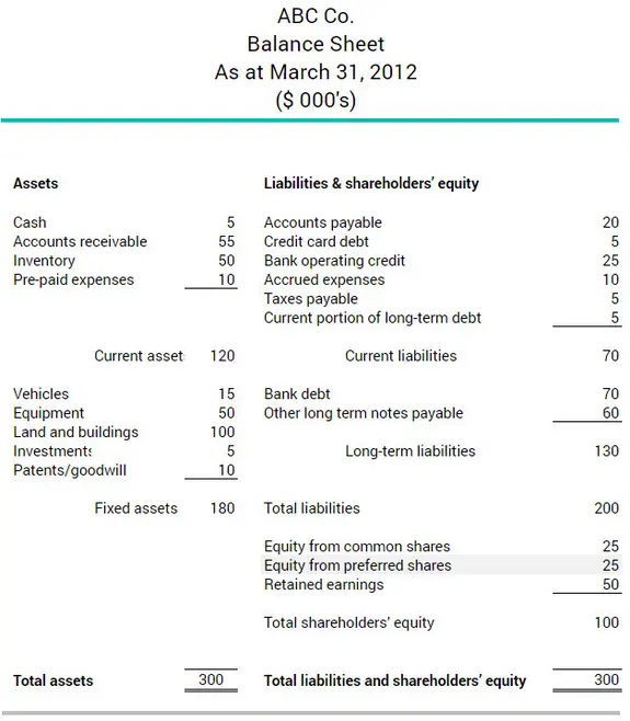 Both preferred and common shares appear under shareholders’ equity on the balance sheet, as shown in the example below: