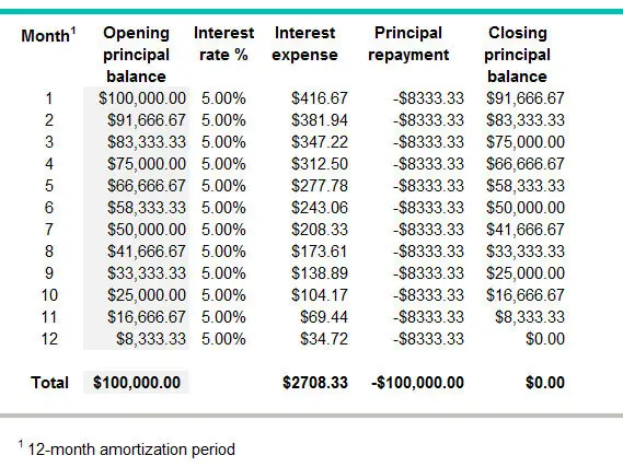 In the example below, ABC Co. borrowed $100,000 in principal and agreed to pay it back in 12 months with interest. The interest rate was 5%. The table shows how the amount of principal owing gets smaller with each payment. The timeline for payback is called the amortization period.