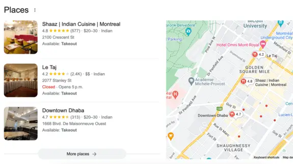 When Google receives a search request with local intent, like “Indian takeout downtown Montreal” or “shoe stores near me” or even just “mechanic”, it includes a map with a list of businesses that could fit that request. Businesses that have effectively set up their local SEO are more likely to appear on that map.