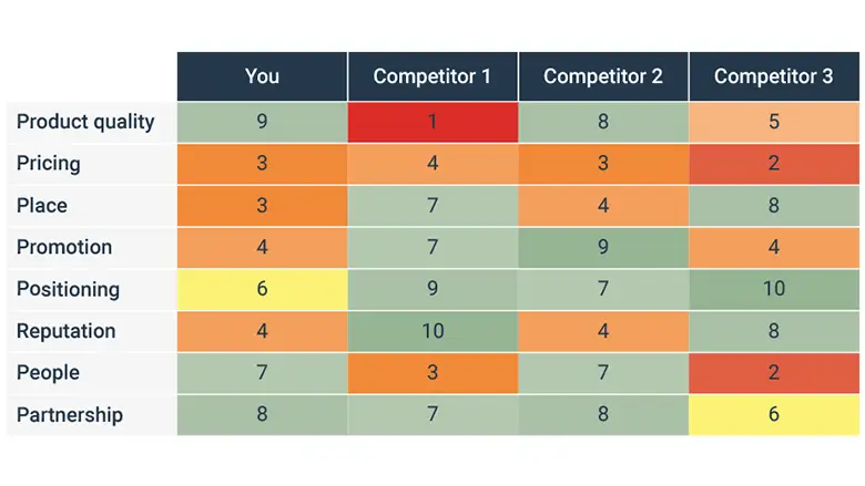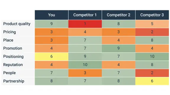 During the two-hour session with your team, it’s important that you can easily compare the performance of your competitors with your own. Start by ranking your competitors in the criteria listed above on a scale from 1 to 10, suggests Kazim, using a simple grid/table like the one below: