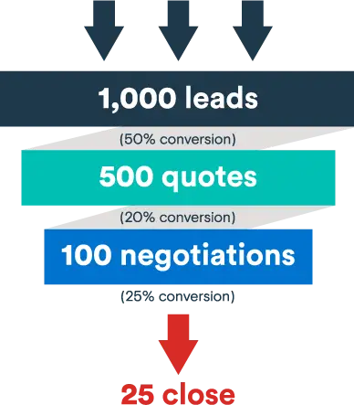 One trick is to think of your sales funnel as a reverse pyramid. If 50% of your leads move on to the quote stage, 20% go on to the negotiations stage and 25% close, then you know that you need to talk to 1,000 leads to sell 25 units.
