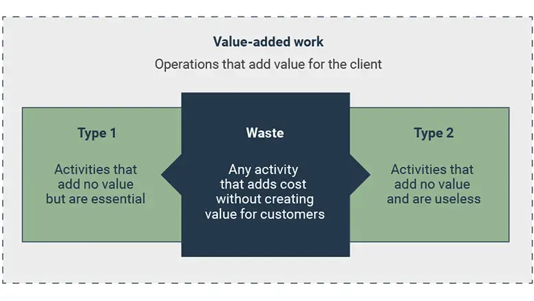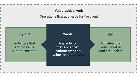 • analysis of areas of waste (e.g. wasted effort, time, movement, resources or space) guided by lean principles