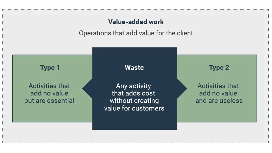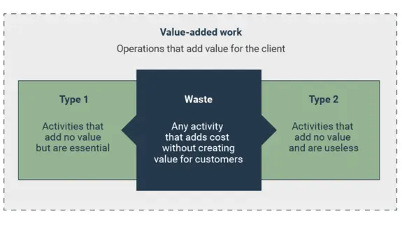 Not the stuff that goes in the trash can, but rather wasted effort, time and resources. Waste is anything which doesn’t add value and which a customer won’t pay for. The lean methodology focuses especially on addressing waste.
