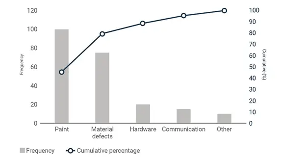 This information should be arranged on a chart from highest to lowest frequency. The highest frequency cause (paint-related issues) would be the first bar at the left of the chart, followed by material defects and so on (see chart below).