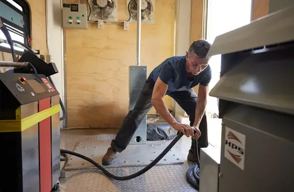 How do I describe what it looks like? It’s a 16-feet trailer with a lot of components. It has re-energizing guns going outside the trailer windows or the main door that comes down. You can walk inside of it. We designed it so it could work regardless of how the producer was powering their film set. All the components are designed to pull the trailer up to where it can be tied to either an existing electric grid infrastructure or a generator. Once it’s connected, it powers a Level III charger that you can plug into your truck. Our first prototype was a 60-kilowatt charger that could charge a Class 6 truck in four hours.