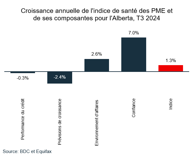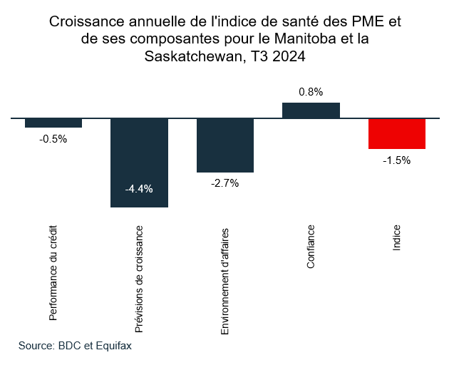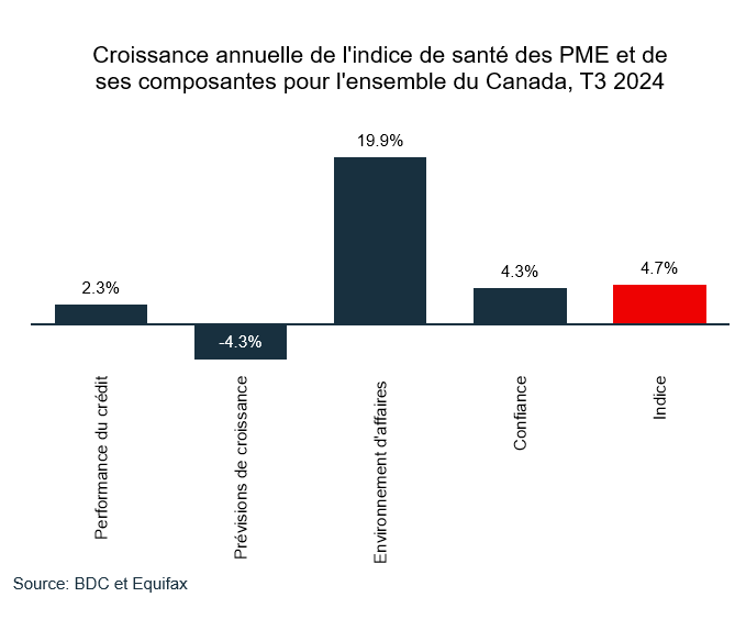 L’amélioration de l’environnement des affaires est le facteur qui a le plus contribué à cette augmentation, alors que l’économie commence à montrer des signes de reprise. Le taux d’inflation est revenu à l’objectif de 2 % de la Banque du Canada et la banque centrale a commencé à réduire son taux directeur en juin 2024. En conséquence, la confiance des entreprises s’améliore, les PME s’attendent à de meilleures perspectives économiques et l’accès au crédit s’assouplit. Toutefois, la stagnation des ventes et la faiblesse des plans d’investissement continuent de nuire aux PME, ce qui a un effet négatif sur la composante des prévisions de croissance. La performance du crédit des PME ne s’est pas encore entièrement remis de l’impact des taux d’intérêt élevés, toutefois la tendance évolue lentement dans une direction positive.