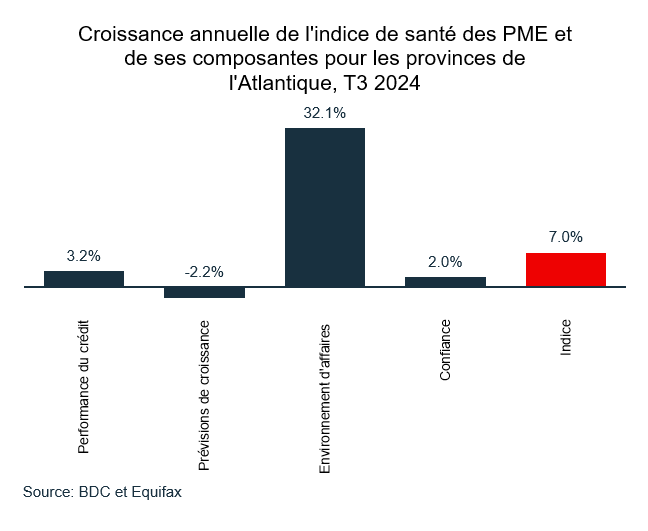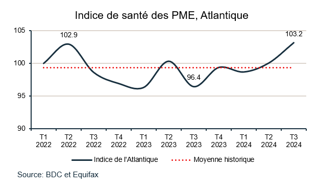 L’indice de la région de l’Atlantique a dépassé l’indice national au T3 2024. Il s’est établi à 103,2, affichant une augmentation de 7,0 % par rapport à la même période l’an dernier et une hausse de 3,1 % par rapport au trimestre précédent. La performance du crédit des entreprises de la région s’est amélioré, tandis que les taux d'arriérés anticipés ont diminué. La croissance de l’emploi et des salaires a également été plus forte dans ces provinces, ce qui a contribué à la forte augmentation de la composante de l’environnement des affaires. Cela semble également avoir eu un impact sur la confiance des entreprises, car les perspectives économiques des PME étaient plus optimistes.