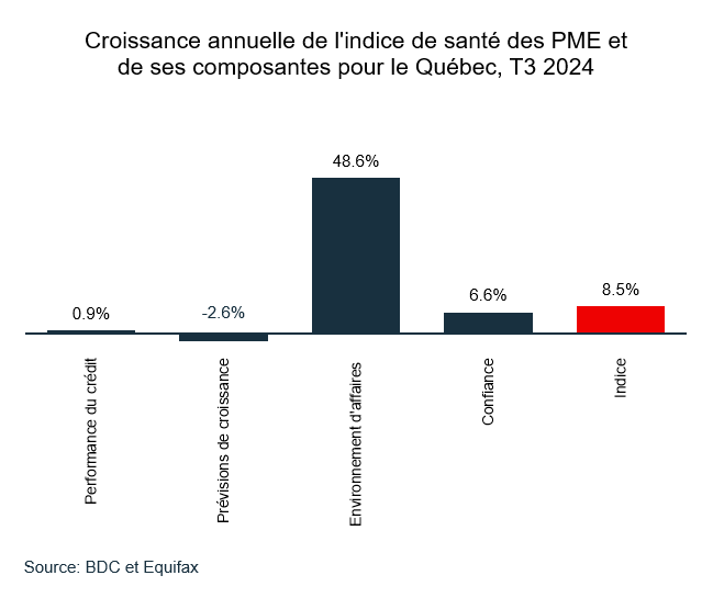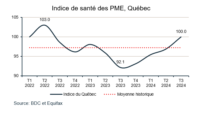 La santé des entreprises québécoises a affiché une forte croissance au T3 2024, après un PIB stagnant en 2023. Dans l’ensemble, l’indice s’élevait à 100,0, soit une hausse de 8,5 % par rapport à l’année dernière et de 3,2 % par rapport au trimestre précédent.