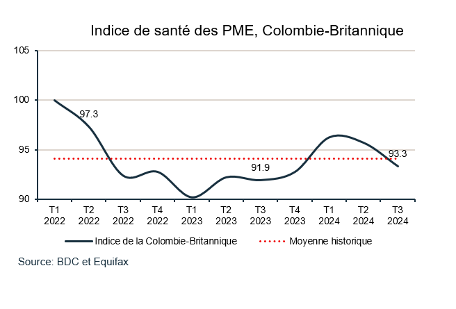 La tendance de la Colombie-Britannique présente une tendance différente de celle des autres régions. Bien que la santé des PME se soit redressée au début de l’année, la tendance s’est désormais inversée, perdant une partie de ses gains.