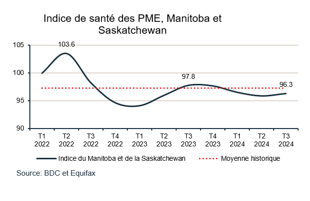 L’indice du Manitoba et de la Saskatchewan connaît des fluctuations depuis un an. Au T3 2024, il s’élevait à 96,3, soit 1,5 % de moins que l’an dernier, mais 0,5 % de plus que le trimestre précédent.