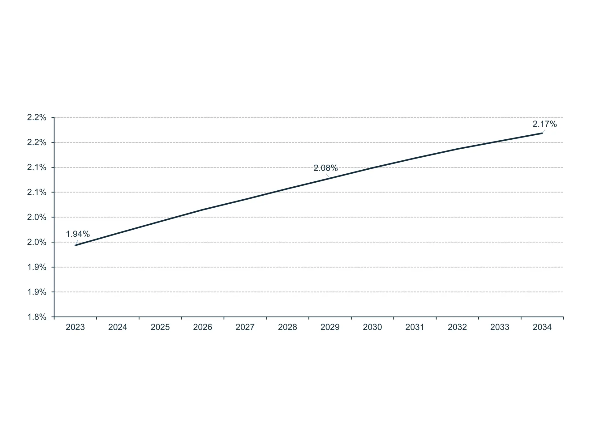 Grille de lecture: Ce graphique montre que la part des Autochtones dans l’entrepreneuriat au Canada devrait passer de 1,94 % en 2023 à 2,17 % en 2034.