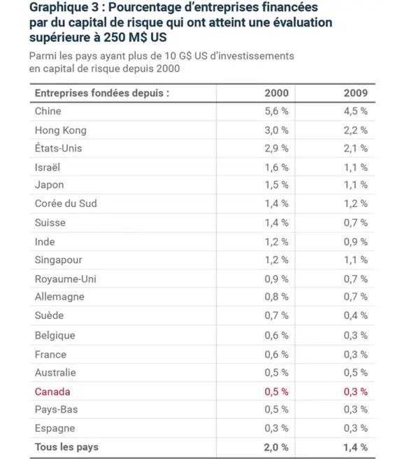 Le graphique 3 présente le pourcentage des entreprises dans chacun des pays fondées au cours des 20 dernières années dont la valeur dépasse maintenant 250 millions de dollars américains (aux fins de cette analyse, appelons-les des Connaissez-vous réussites»2).