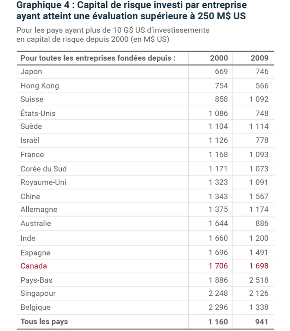 Nous avons ensuite mesuré l’efficacité de notre écosystème de capital de risque (graphique 4). Si nous supposons qu’un écosystème de capital de risque est une machine qui crée des entreprises en démarrage, nous pouvons évaluer l’efficacité de ces machines en comparant le capital de risque que nous devons injecter dans l’écosystème pour créer une réussite.