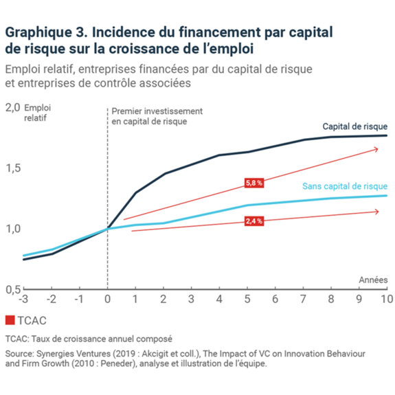 En ce qui concerne la création d’emplois, le taux de croissance annuel composé de l’emploi des entreprises financées par du capital de risque est supérieur de 2,4 % à celui des entreprises non financées par du capital de risque (graphique 3).
