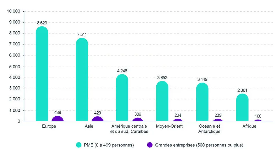 Même si le pourcentage des exportations du Canada aux États-Unis effectuées par des PME est de seulement 40 %, il monte à 43 % pour le Moyen-Orient, à 44 % pour l’Europe, à 50 % pour l’Amérique centrale et l’Amérique du Sud et à 52 % pour l’Océanie. L’Asie est la seule région où les exportations par les PME représentent une proportion moins élevée des exportations totales du Canada (35 %).