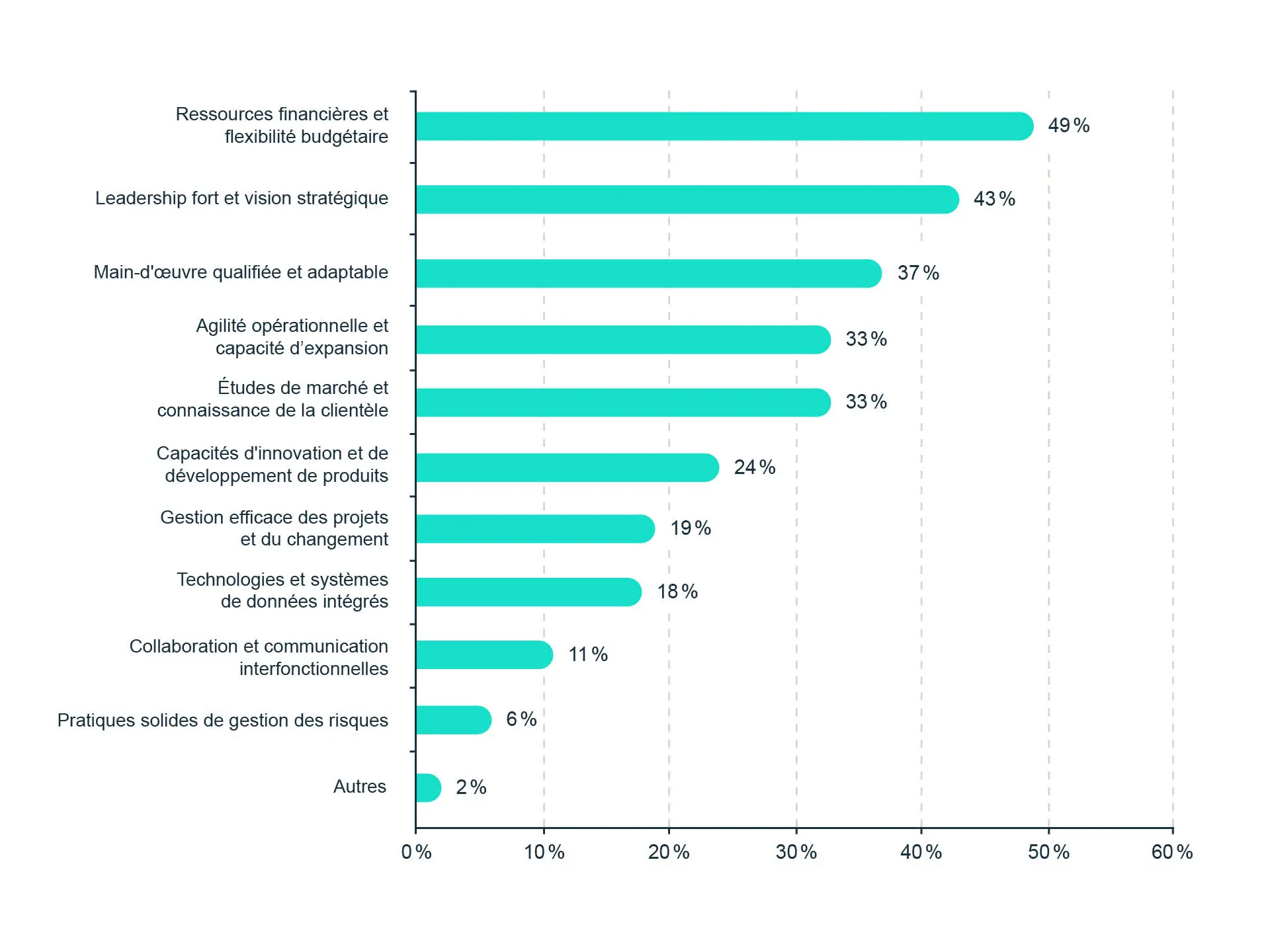 D’autres facteurs internes sont également jugés essentiels, quoique dans une moindre mesure, comme l’agilité opérationnelle et la capacité à évoluer à plus grande échelle (33 %), de même que la recherche de marché et la compréhension de la clientèle (33 %). Enfin, des aspects comme l’innovation et le développement de nouveaux produits (24 %), la gestion efficace de projets et du changement (19 %), ainsi que l’intégration des technologies et des données (18 %) complètent la liste.