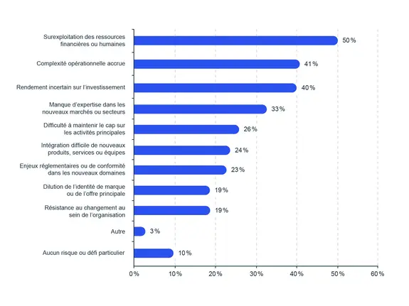 Le manque d’expertise dans de nouveaux marchés ou secteurs (33 %) et la difficulté à garder le cap sur les activités principales (26 %) sont aussi des obstacles fréquemment cités. D’autres enjeux comme l’intégration de nouveaux produits ou équipes (24 %), les contraintes réglementaires (23 %) ou encore la dilution de l’identité de marque (19 %) figurent également parmi les préoccupations.