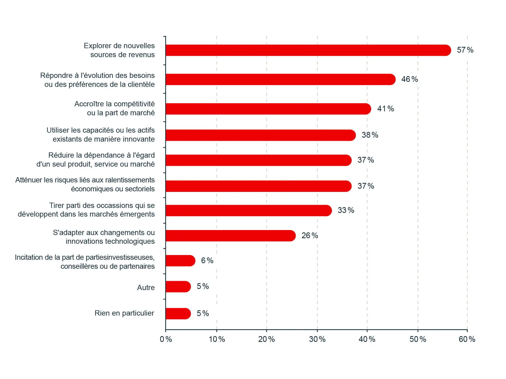 En réponse à une question leur demandant ce qui motivait leur plus récente initiative de diversification, 57 % des propriétaires d’entreprise ont indiqué vouloir explorer de nouvelles sources de revenus.