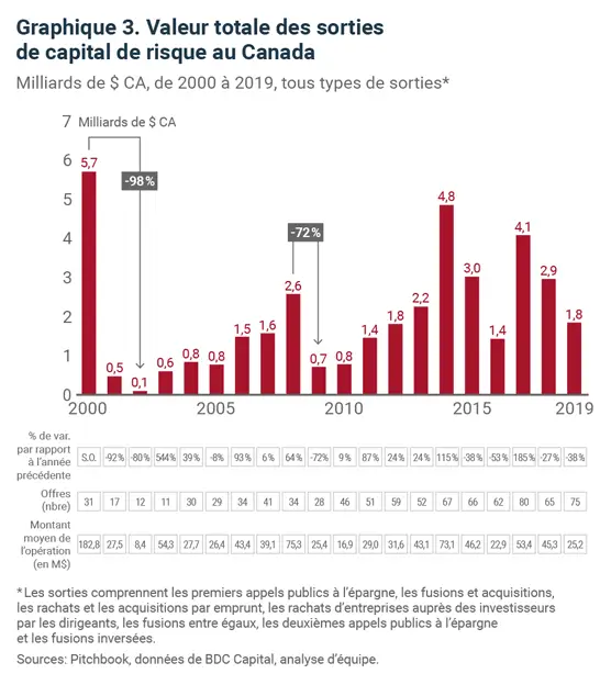 Les résultats de sortie des sociétés de capital de risque canadiennes se sont considérablement améliorés ces dernières années. La taille médiane des sorties au Canada a été multipliée par 3,8 entre 2016 et 2019. En ce qui concerne le délai de sortie par rapport au premier financement, le Canada a atteint la parité avec les États-Unis en présentant un résultat de 6,1 ans au cours de la même période.